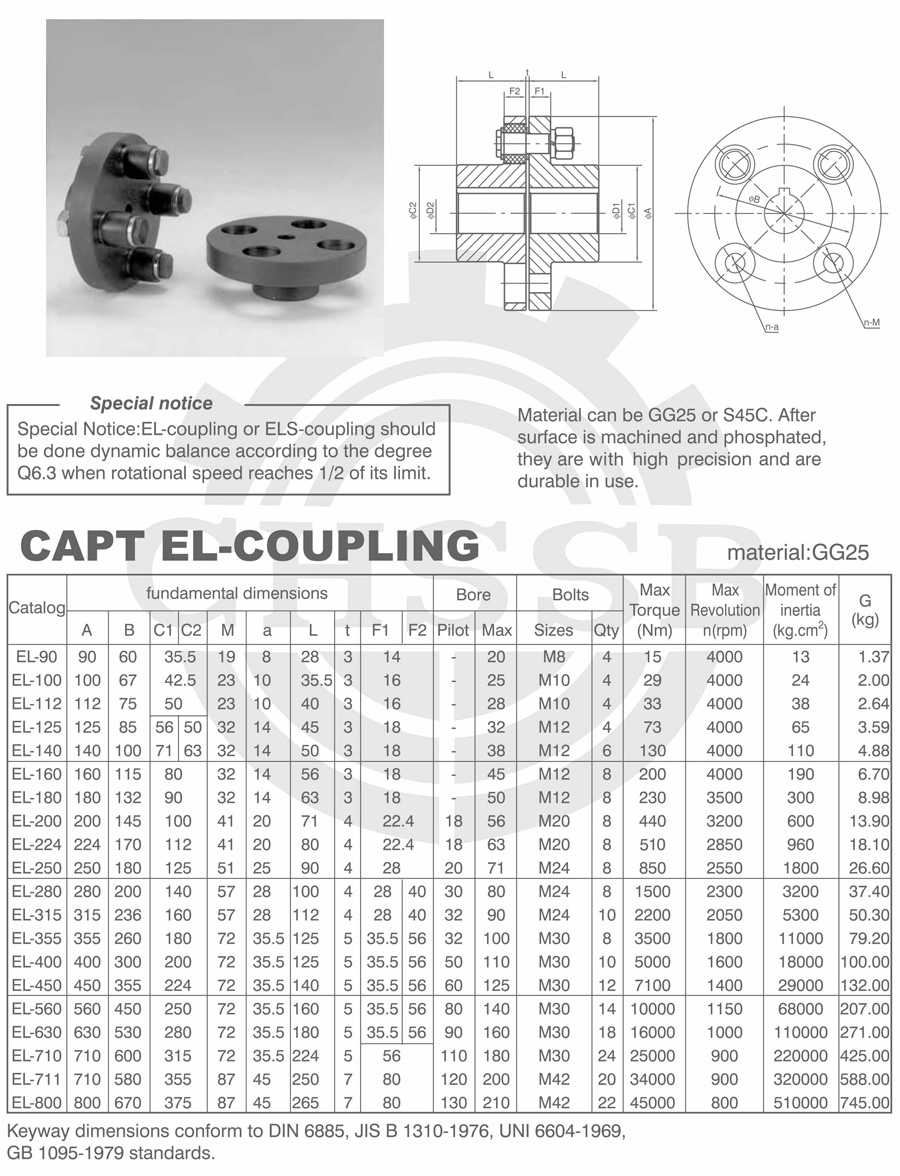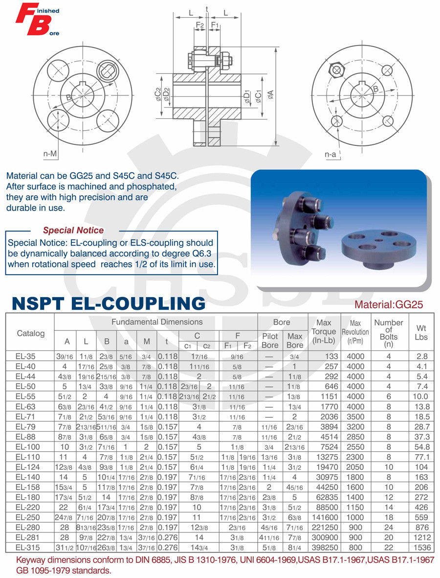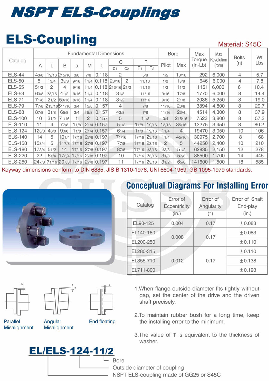 產品范圍: 美標:(EL/ELS) 歐標:(EL/ELS) 英制尺寸產品(適用于美標市場) 公制尺寸產品(適用于歐標市場) EL型聯軸器 ELS型聯軸器