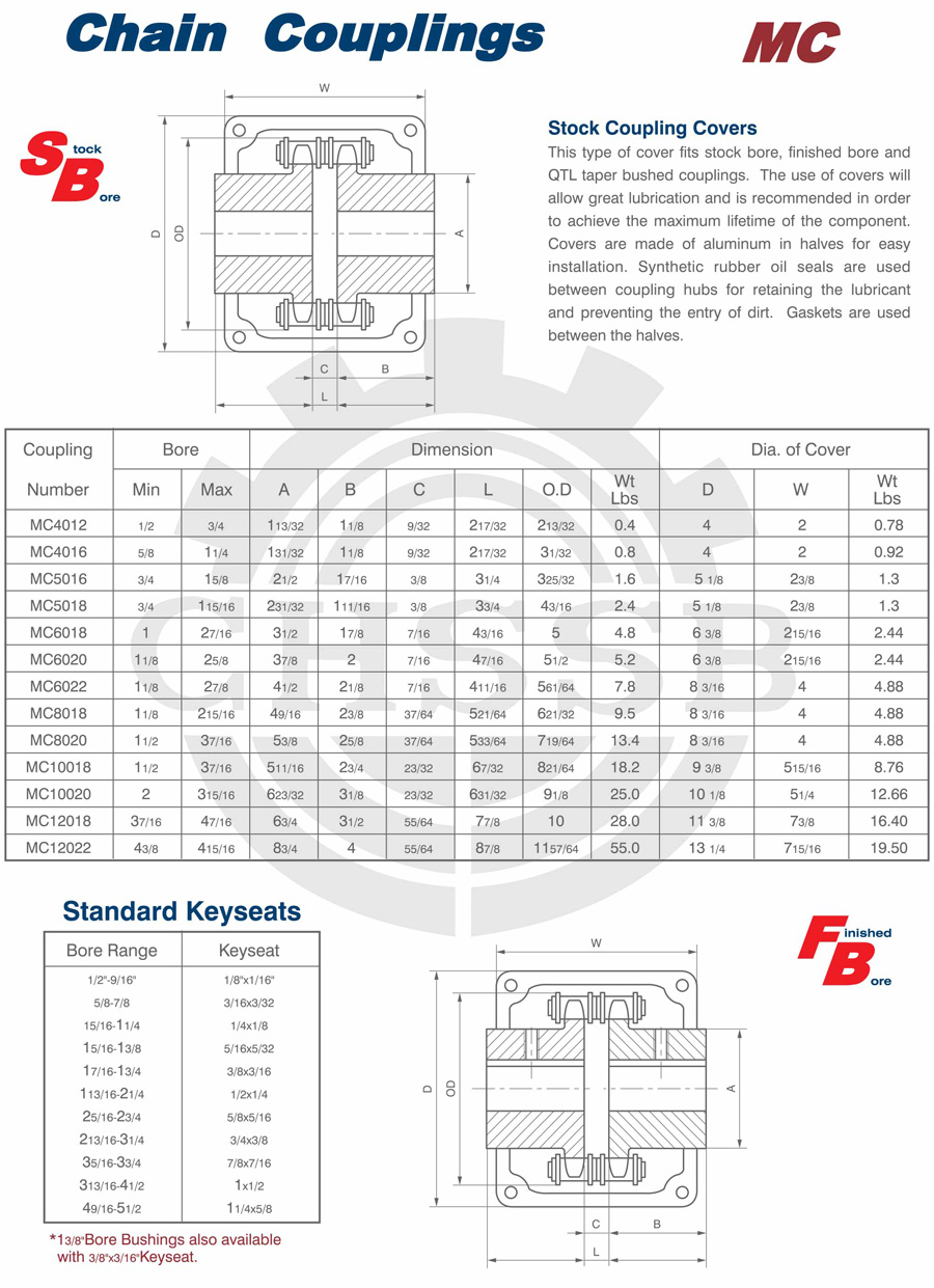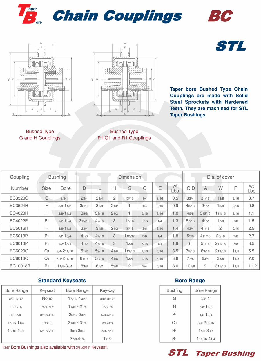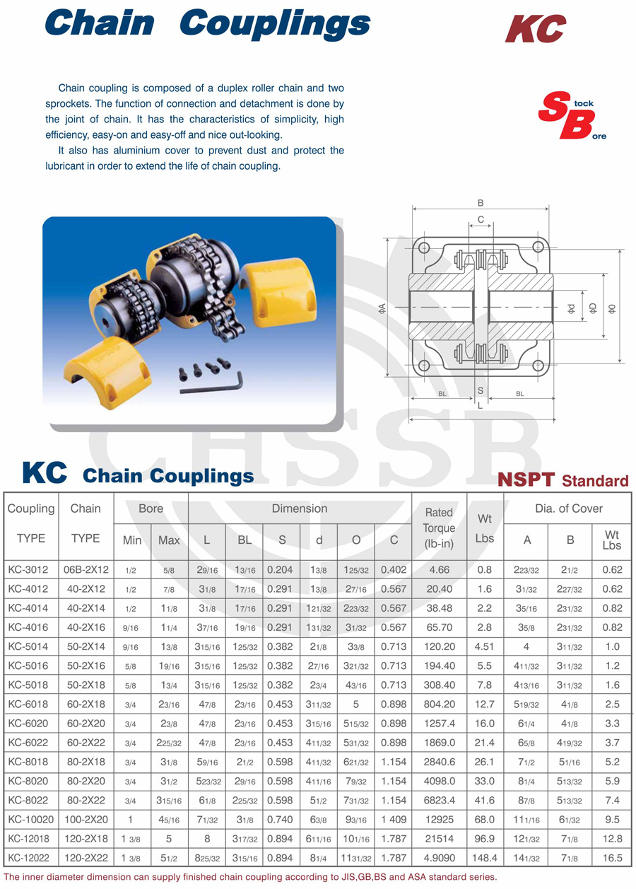 產(chǎn)品范圍: 美標:(SB-KC/FB-KC/FB-MC/BTL-MC/QTL-MC/FB-BC/STL-BC) 歐標:(KC) 英制尺寸產(chǎn)品(適用于美標市場) 公制尺寸產(chǎn)品(適用于歐標市場) KC鏈條聯(lián)軸器